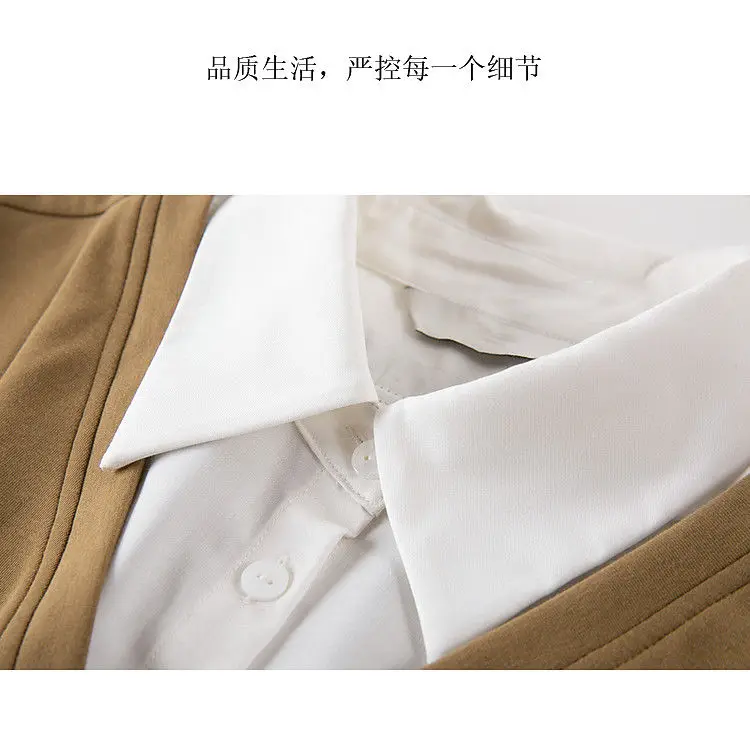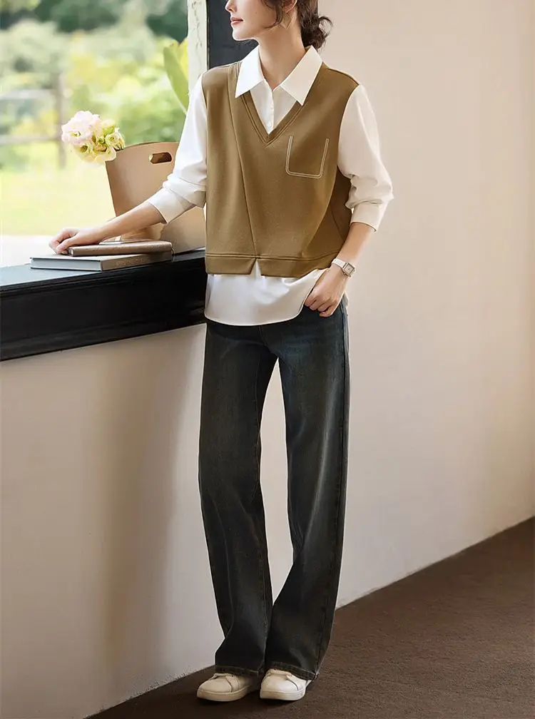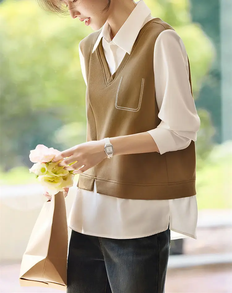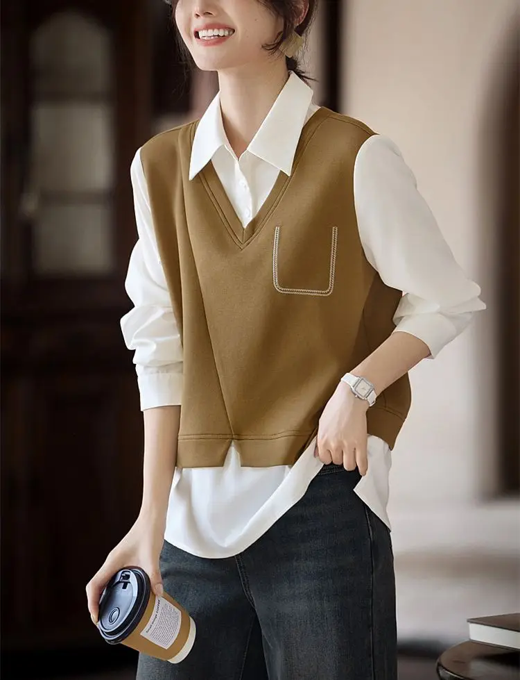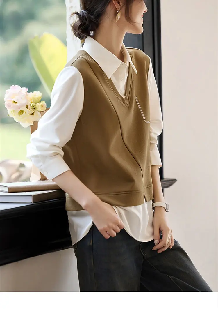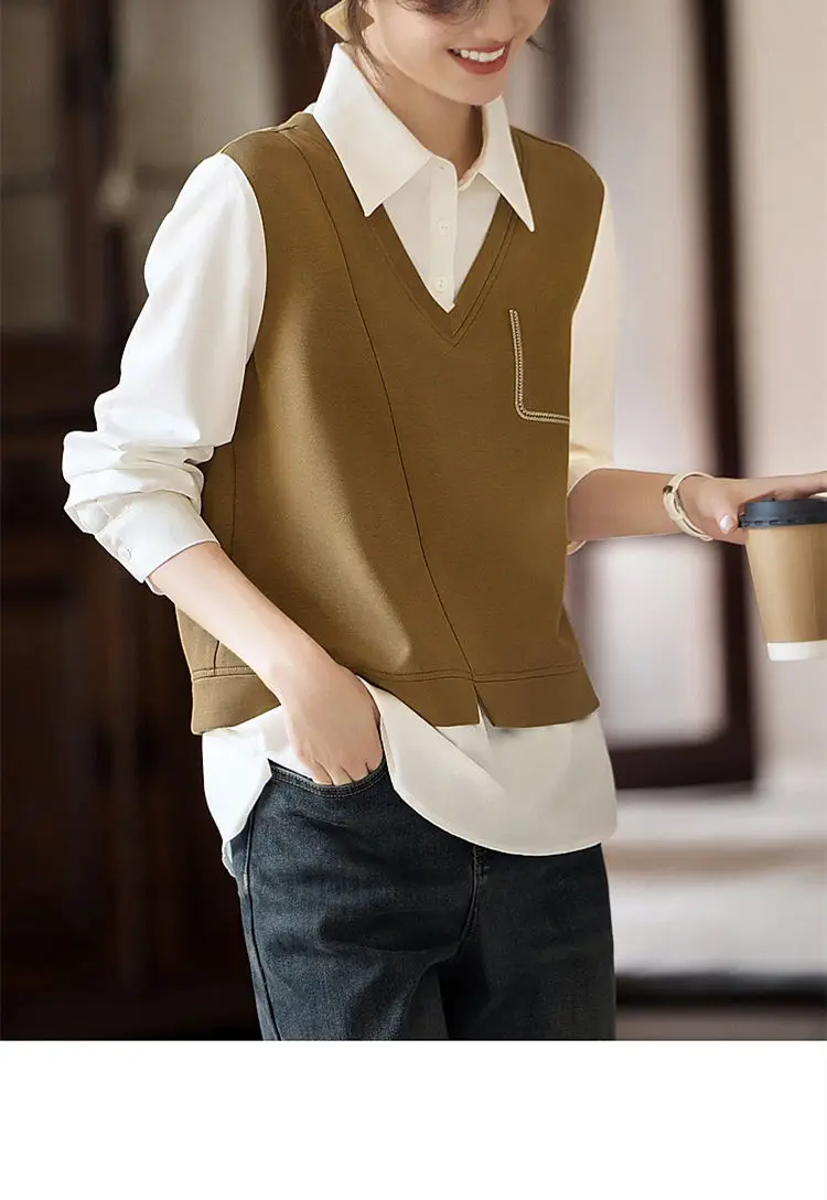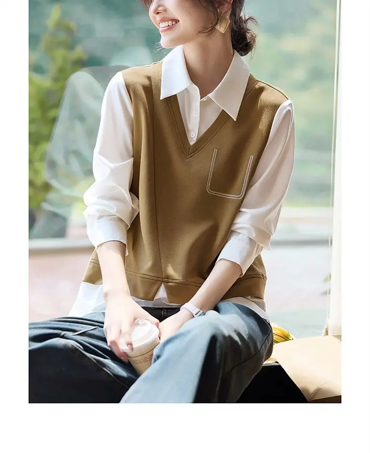 Fake Two-piece Vest Shirt for Women's Pullover Polo Collar Contrasting Color Splicing Layered Long-sleeved Top